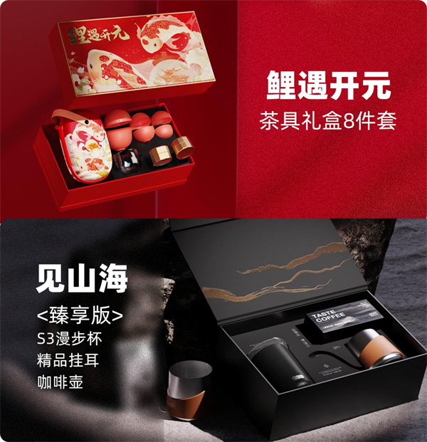 “鯉遇開元茶具禮盒8件套”或“見山海咖啡套裝禮盒”